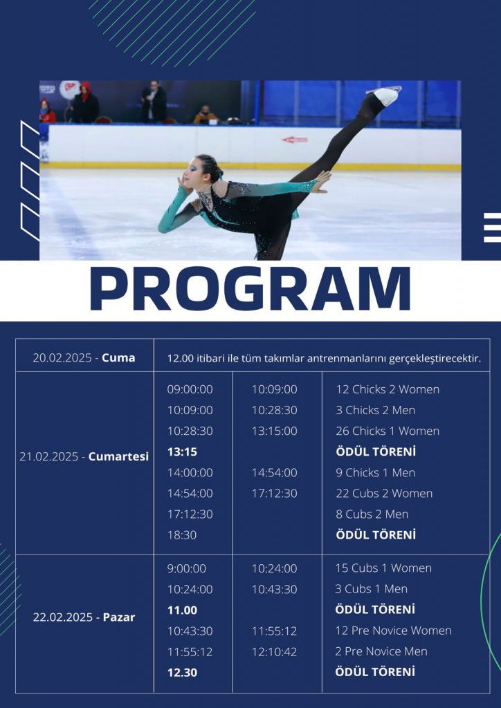20-22 Şubat 2026 tarihlerinde ”Artistik Buz Pateni 2. Bölge Yarışması” Programı aşağıda yer almaktadır. Tüm yurttaşlarımıza Buz Pistimizin kapıları yarışmaları izlemek için ücretsiz olarak açıktır.